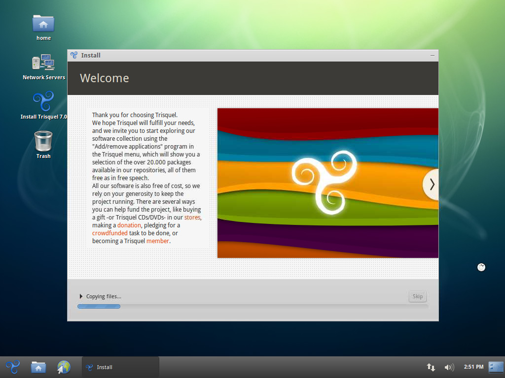 Trisquel GNU/Linux es un sistema operativo totalmente libre para usuarios domésticos, pequeñas empresas y centros educativos.